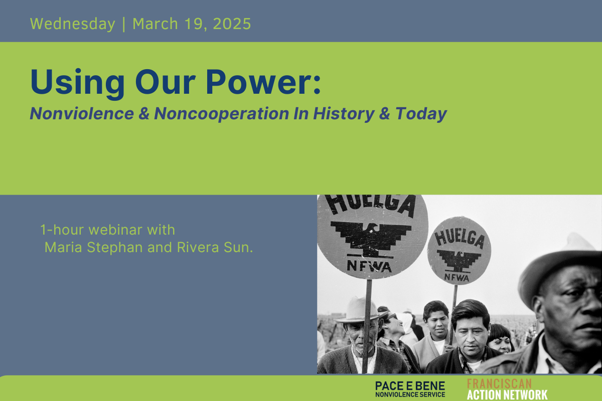 Join Franciscan Action Network and Pace e Bene Nonviolence Service for a special webinar with Maria Stephan (coauthor of the groundbreaking Why Civil Resistance Works) and Rivera Sun (Pace e Bene/Campaign Nonviolence) on how strategies of noncooperation have won change in the past . . . and how people are using them in today’s political crisis. From boycotts to economic blackouts to refusals to obey, there are numerous ways people can resist injustice. These tools of nonviolent action provide key strategic effects for movements and campaigns seeking to confront authoritarian regimes, win social justice, and protect democracy and human rights.