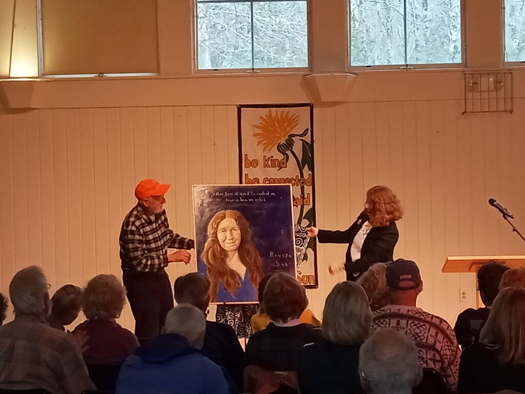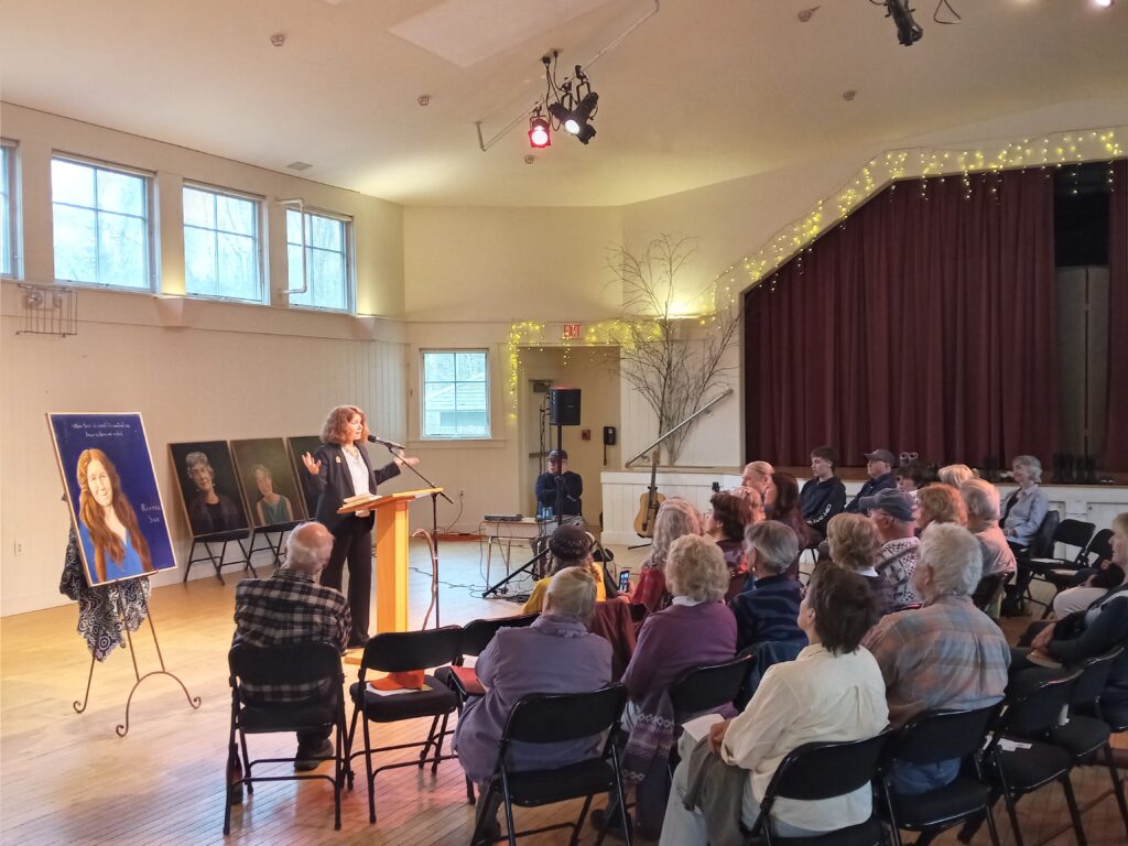 On Sunday, May 4th, 125+ people had a remarkable experience of this world. Seventy-five of them gathered in the beautiful, circular hall of the Bay School in Blue Hill for my Portrait Unveiling in Robert Shetterly’s Americans Who Tell the Truth series. Another 40-50 people virtually joined the in-person crowd that included my mother, sisters, niece and nephews, college friends, peace colleagues, and even the weaver I apprenticed to as a teenager.
