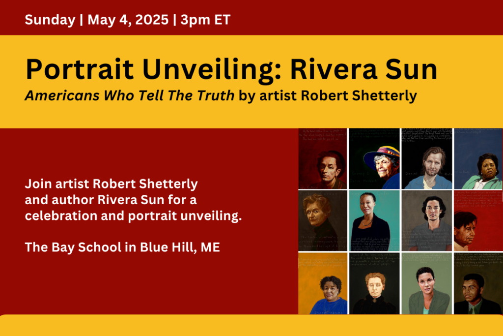 The portrait unveiling will take place in-person at the Bay School in Blue Hill, Maine. It is a school where my novels have been read by the young students and where several unveilings have taken place. Artist Robert Shetterly will explain why he was inspired to paint my portrait. If we’re lucky, schoolchildren will perform a skit from The Adventures of Alaren. My mother and family will attend. My friend and colleague Sherri Mitchell (who is also in the portrait series) will speak.